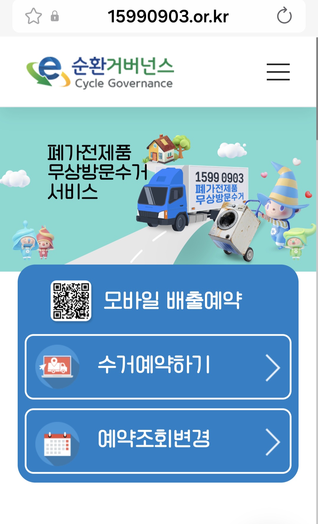 1. 인터넷, 모바일 15990903.or.kr (폐가전제품 배출예약시스템) 에 접속하여 수거 예약 메뉴에서 방문 수거 날짜와 품목을 선택합니다. 개인 정보 입력 후 신청완료 하면 됩니다.