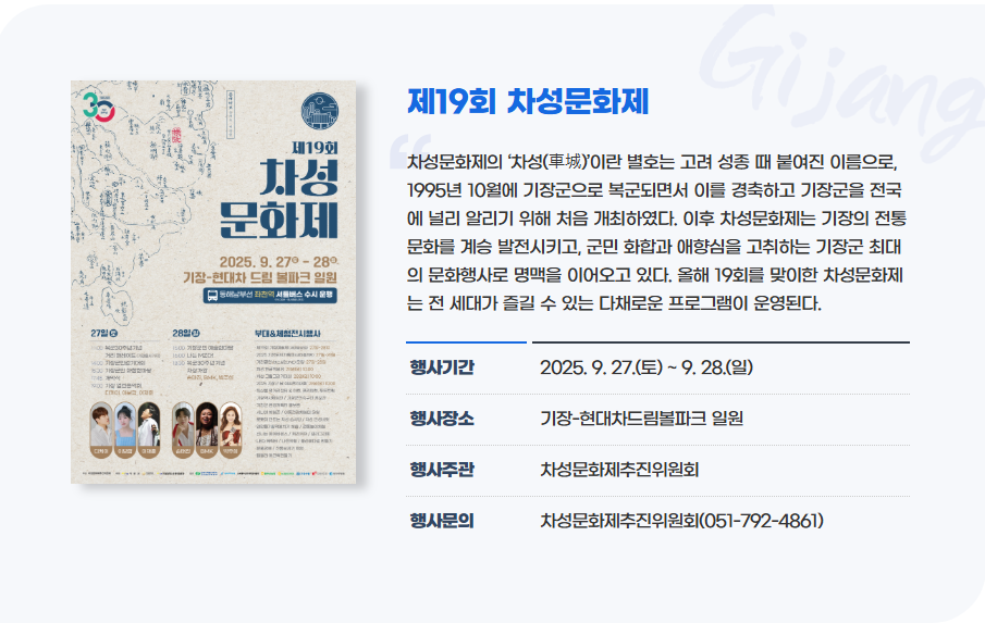 - 자세한 프로그램과 행사 일정은 기장군청 문화관광 홈페이지 또는 차성문화제 공식 SNS를 통해 확인하세요.
