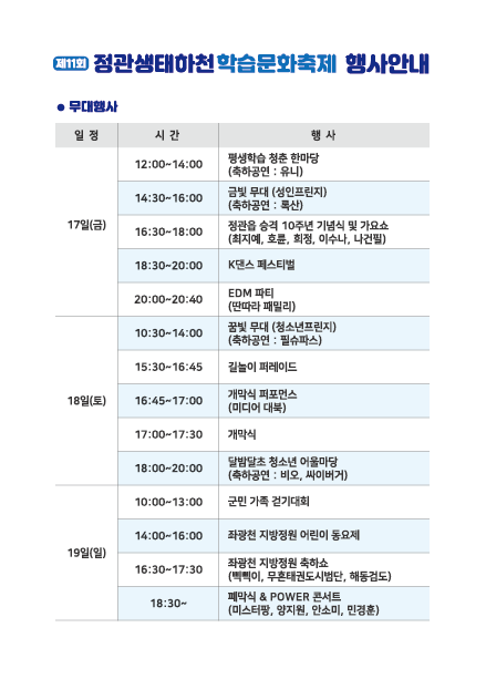 안내도를 꾹 눌러 다운로드 받으세요! 제11회 정관생태하천학습문화축제 행사장 배치도입니다. 다양한 공연...