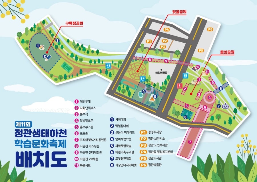 안내도를 꾹 눌러 다운로드 받으세요! 제11회 정관생태하천학습문화축제 행사장 배치도입니다. 다양한 공연...