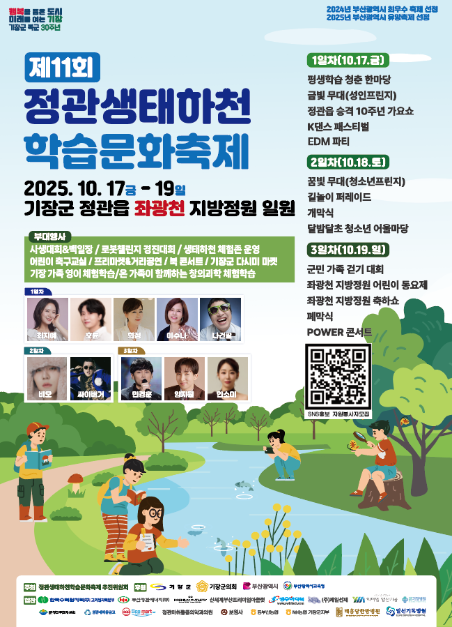 부산 기장군의 젊은 도시, 정관을 가로지르는 생태하천 좌광천 지방정원에서 펼쳐지는 학습. 문화 페스티벌. 소중한 자연환경을 배우고, 즐기고, 나누는 특별한 축제로서 200여 개의 부스에서 경험하는 학습 체험 프로그램, 모든 연령대가 함께 즐길 수 있는 문화, 공연 프로그램을 제공합니다.