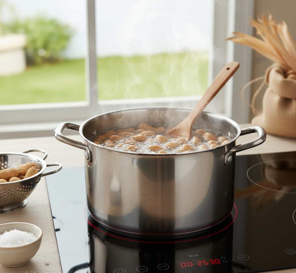 4. 중불로 줄여 20~30분 정도 더 삶아줍니다. 땅콩의 크기나 신선도에 따라 삶는 시간을 조절해 주세요. (하나를 꺼내 맛보고 익었는지 확인하는 것이 가장 좋습니다.)