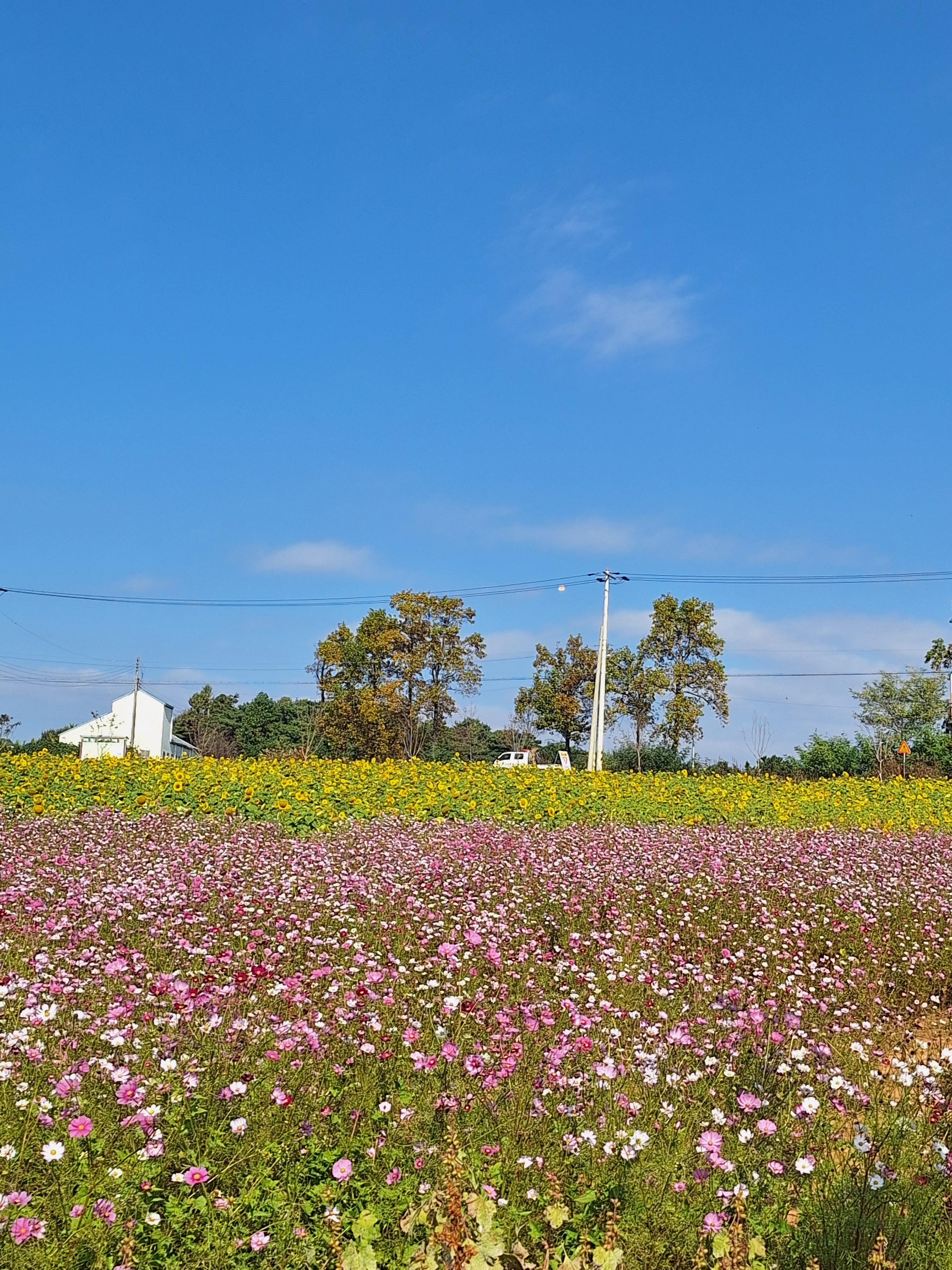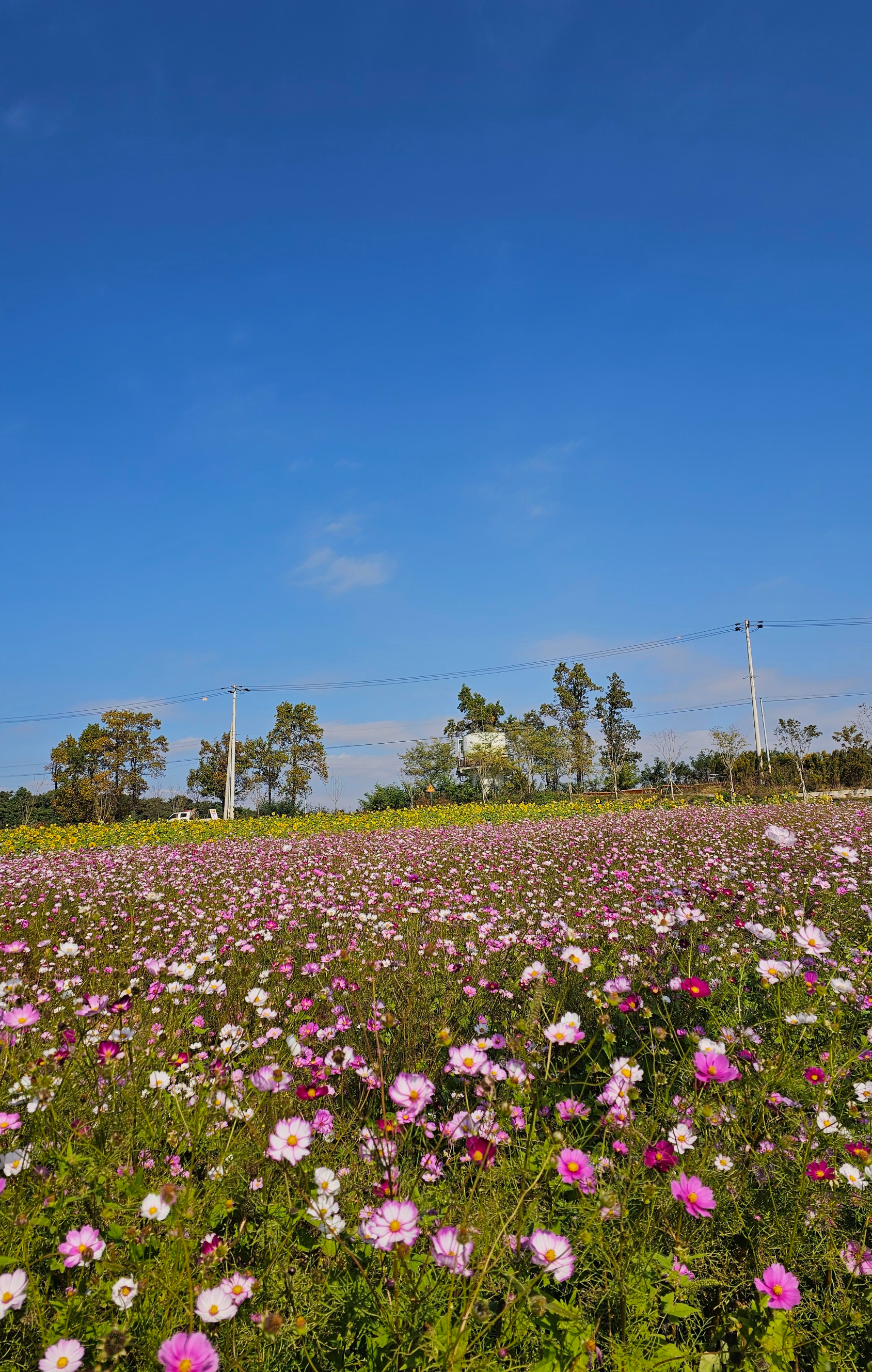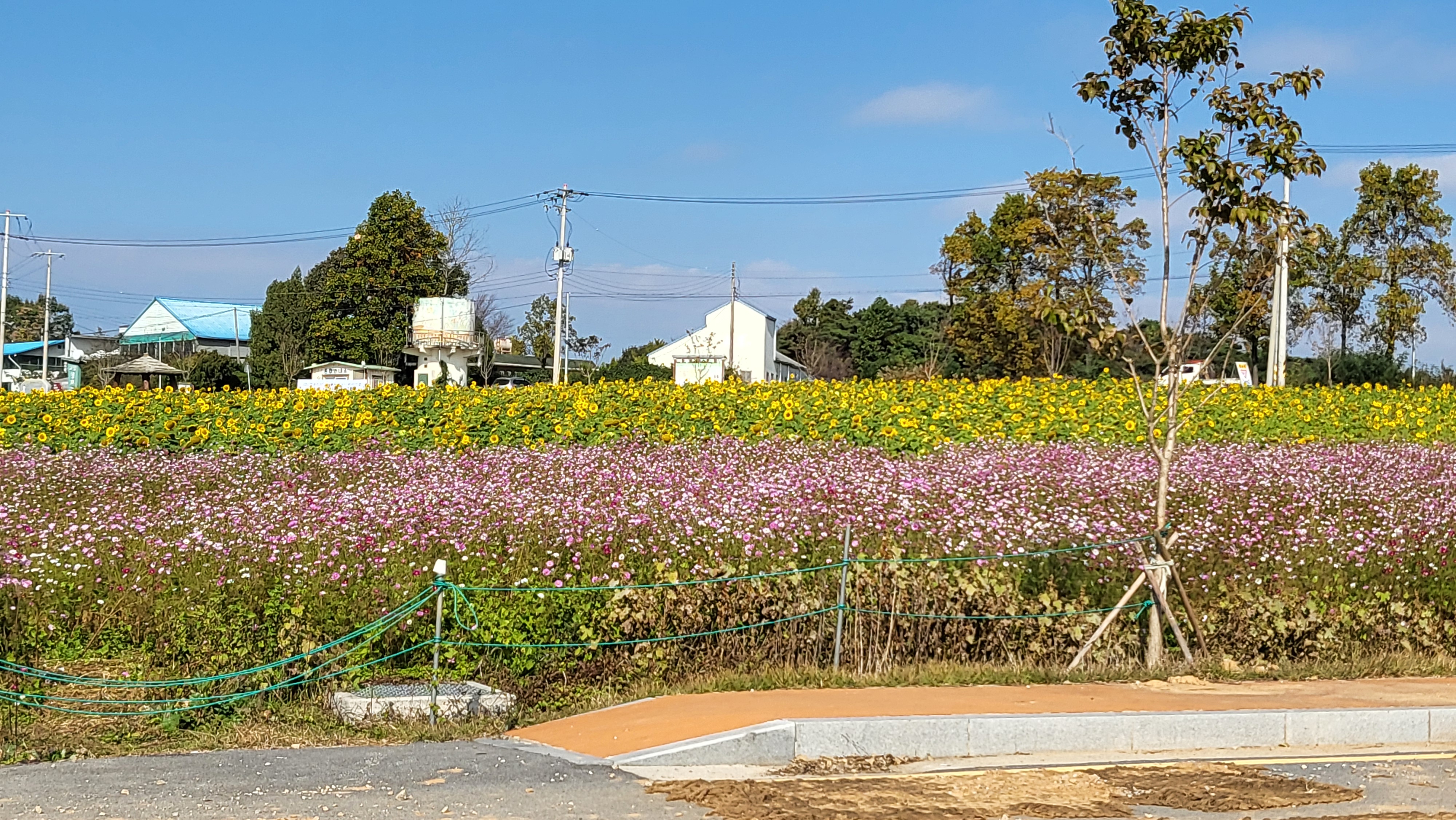 메밀꽃 시즌이 끝날 무렵이었지만, 코스모스와 해바라기가 남아 있었어요. 그래서 풍성한 가을 정취를 느낄 수 있었습니다. 코스모스 밭 사이에서 인생샷을 남기는 분들도 많았답니다.