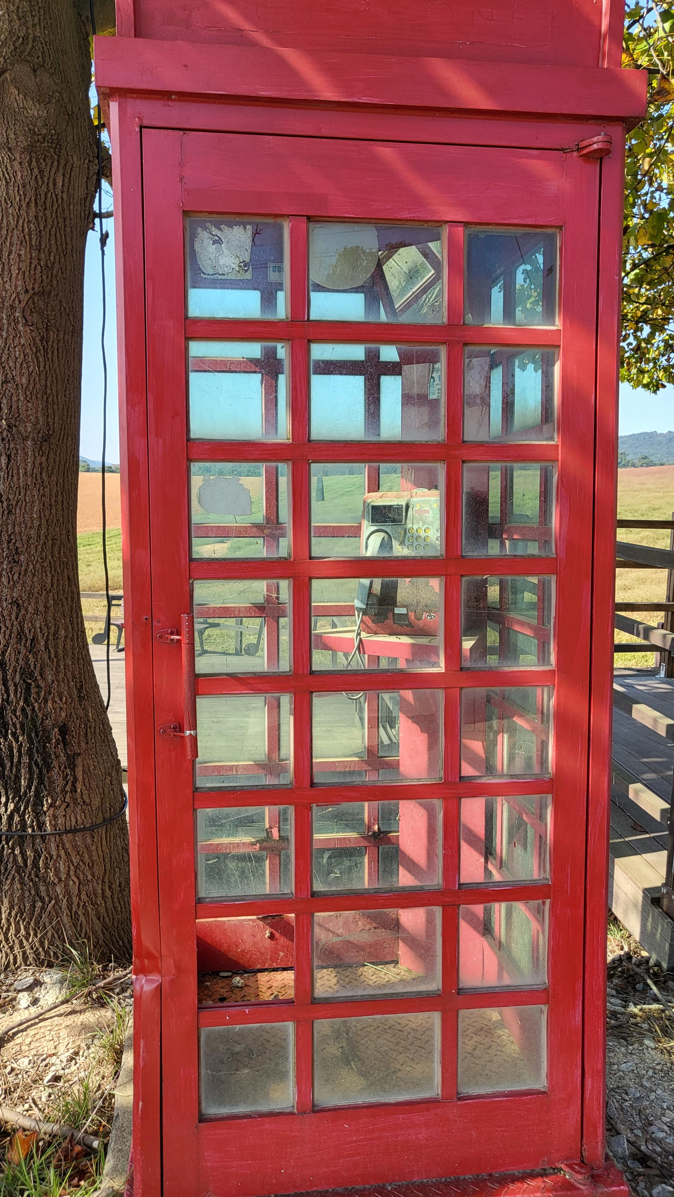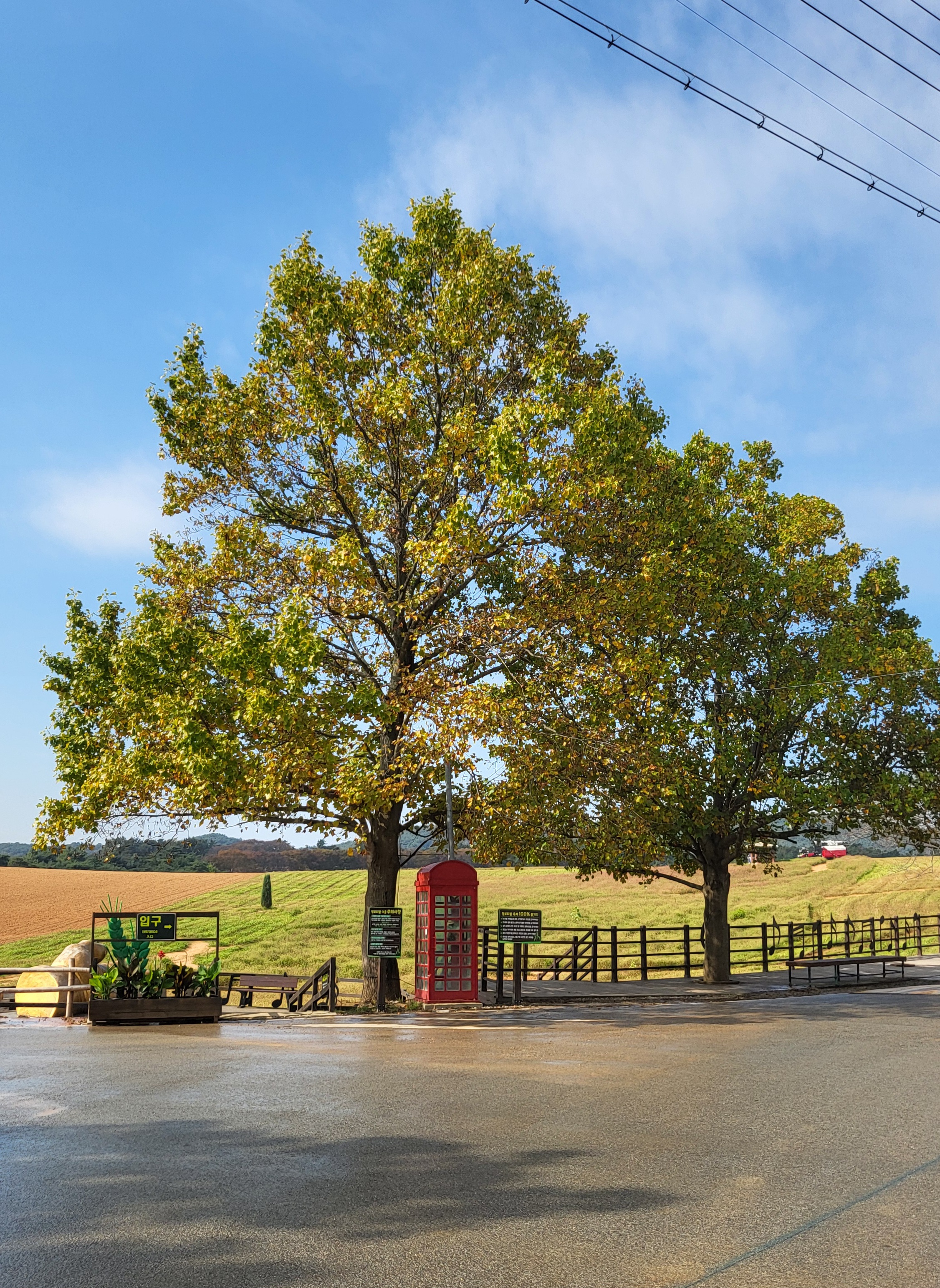 나무 아래에 있는 빨간색 공중전화 부스가 가을날의 특별한 추억을 담아갈 수 있는 감성적인 포토존이 되어 주고 있네요.