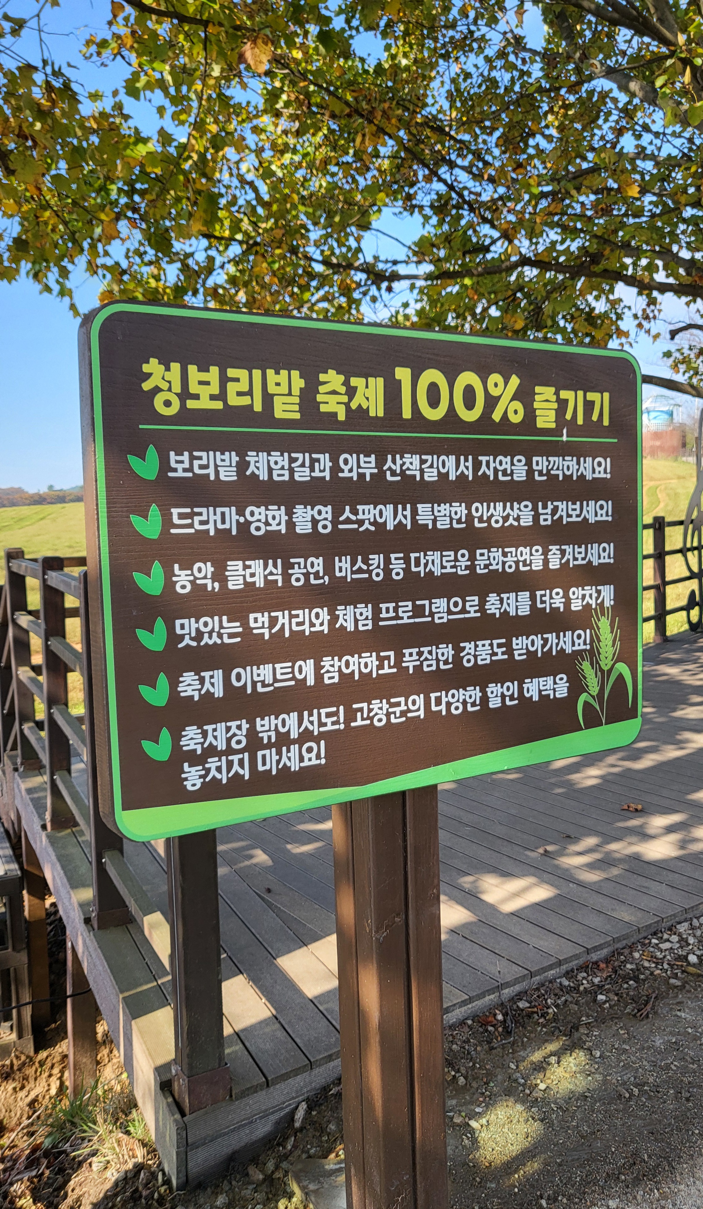 농장 입구에 들어서자마자 반겨준 것은 "청보리밭 축제 100% 즐기기" 안내판이었습니다. 이 안내를 보니 봄 축제 때 방문했다면 더 좋았겠다는 아쉬움이 남았어요. 하지만 드넓은 보리밭 산책로와 드라마/영화 촬영 스폿은 사계절 내내 열려있으니 위로가 되었어요.