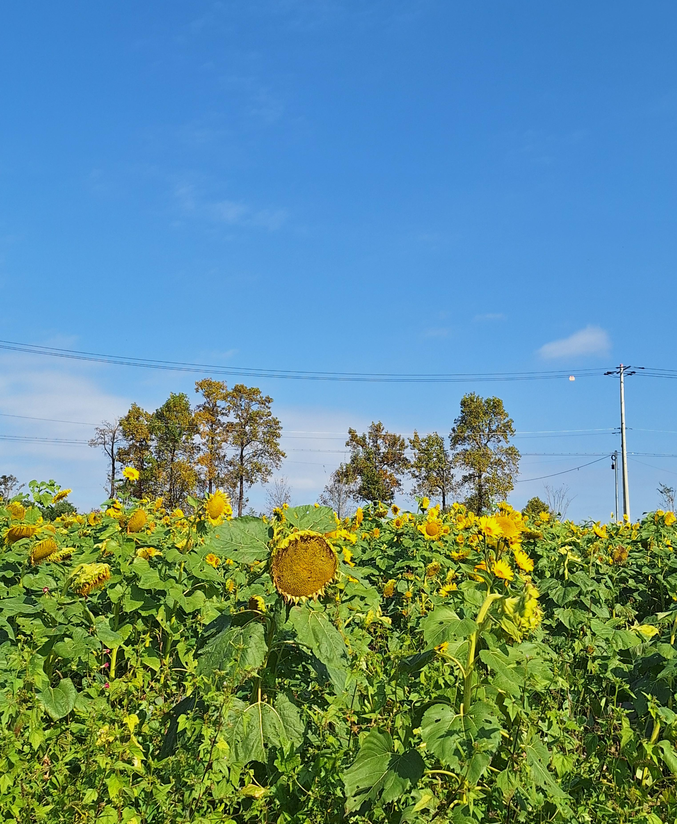 그리고 늦가을까지 남아 고개를 숙이고 있던 해바라기 밭도 놓칠 수 없는 포토존이었습니다. 여름이 지났음에도 꿋꿋이 남아 가을 햇살을 머금고 있는 모습이 인상적이었어요.