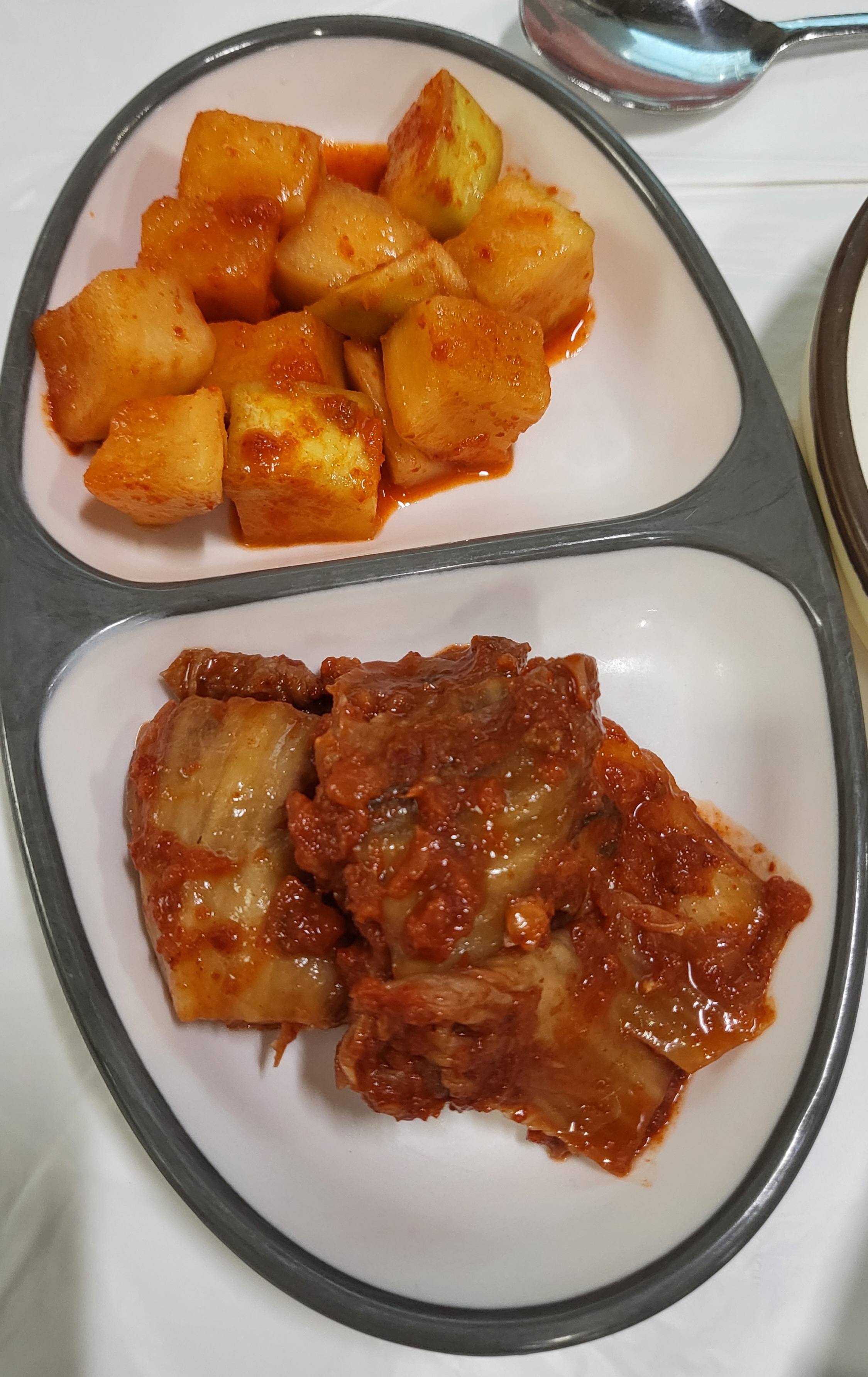 칼국수의 맛을 완성하는 것은 바로 김치와 깍두기입니다. 아삭하게 잘 익은 매콤 달콤한 깍두기가 시원한 국물과 잘 어울렸어요.