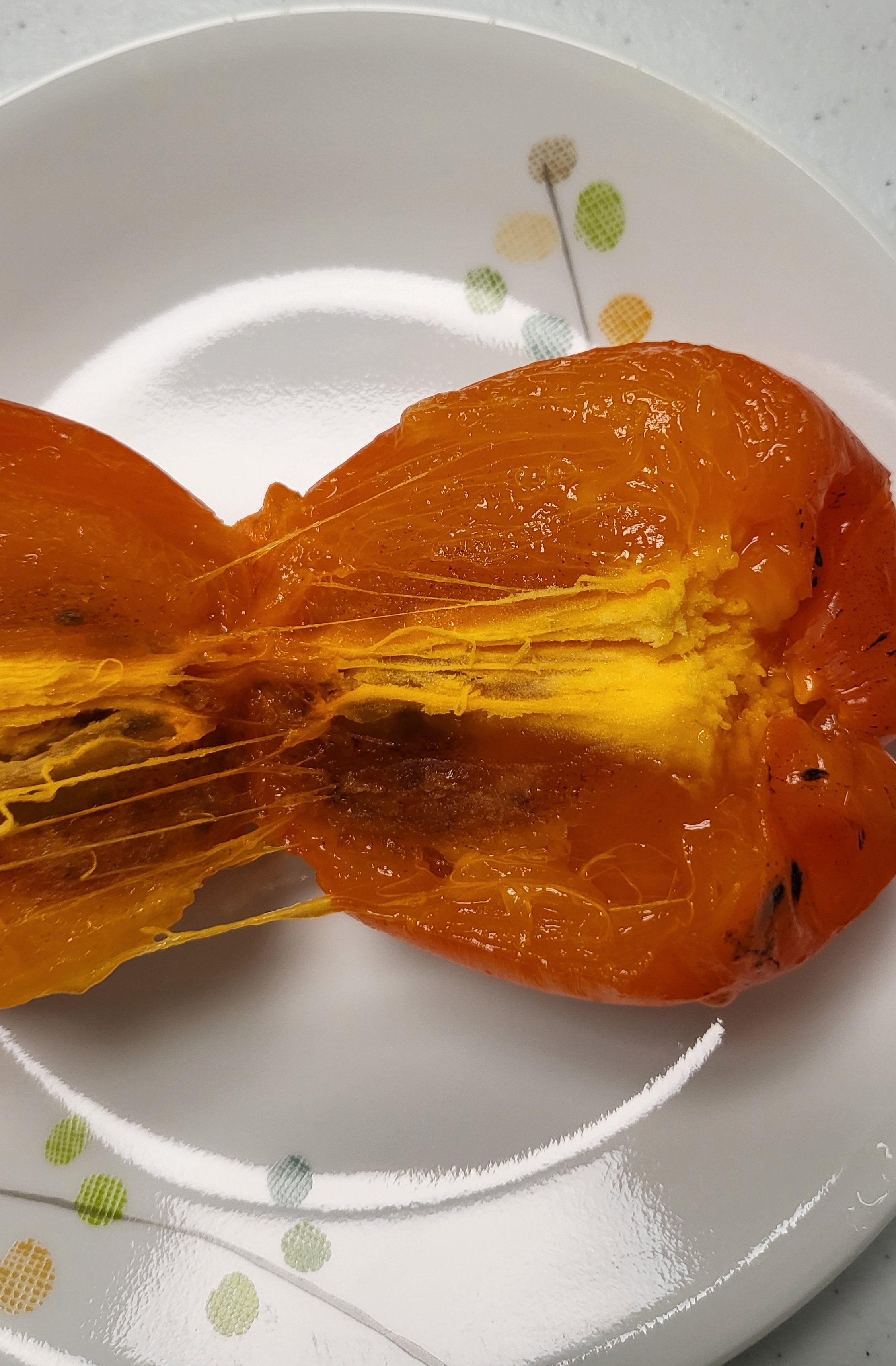 📌홍시를 반으로 갈랐을 때 가운데 보이는 하얀 심 부분은 변비를 유발할 수 있으므로 꼭 제거하고 드시는 게 좋습니다.