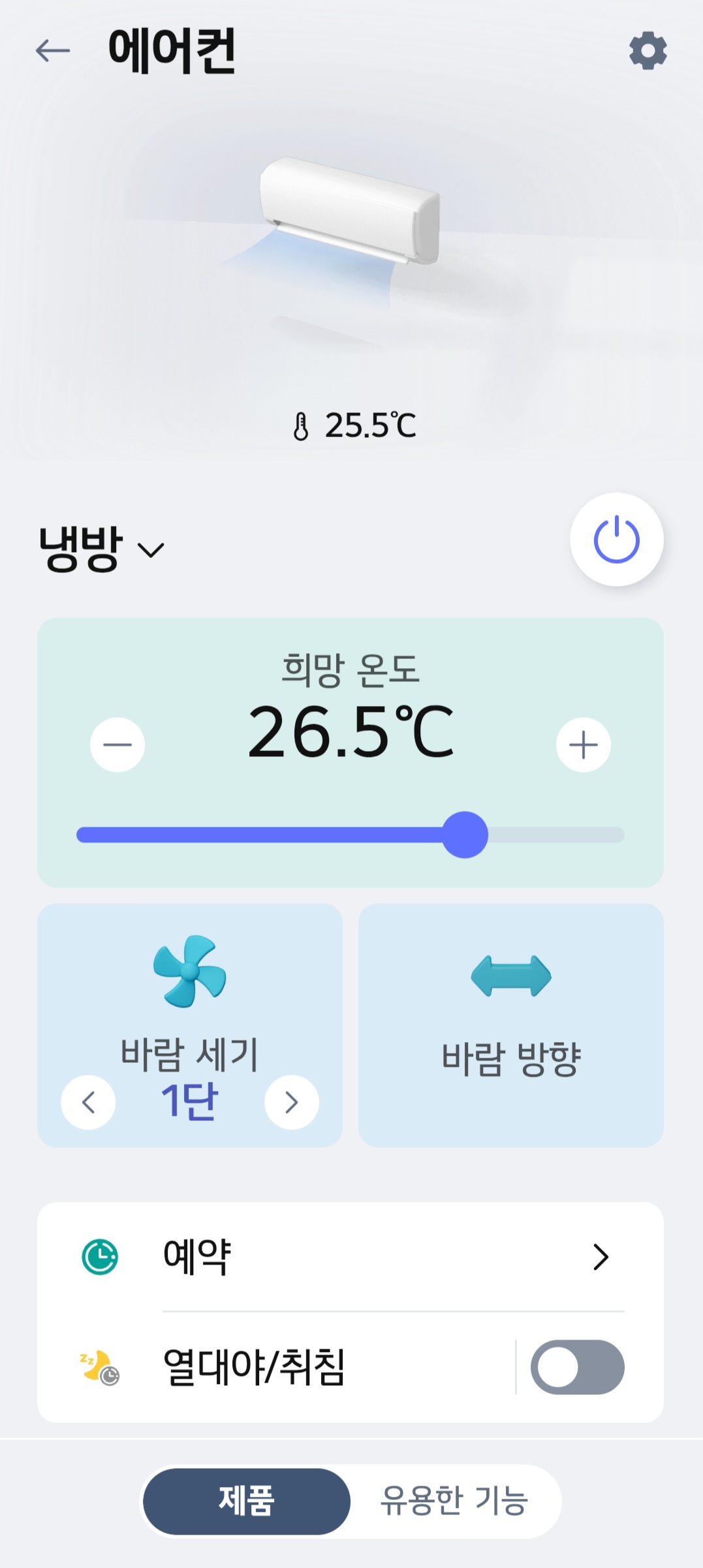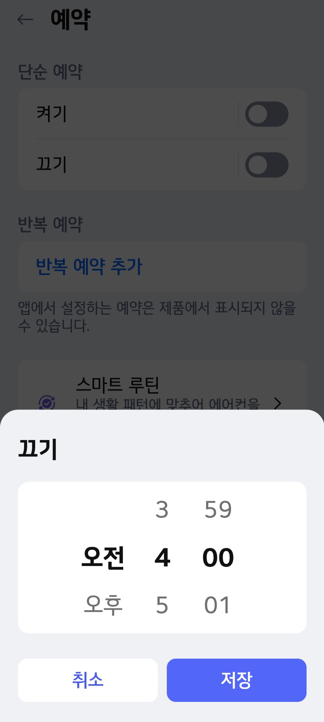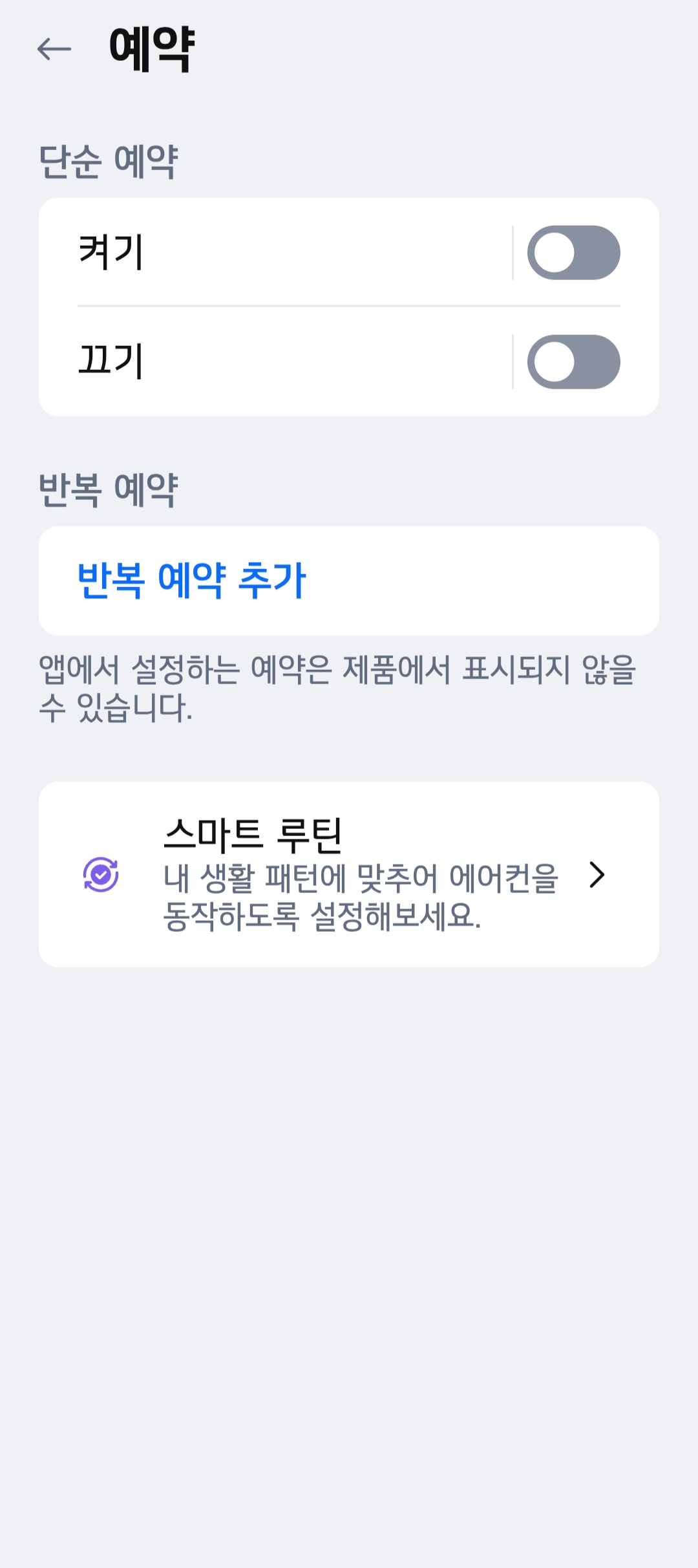 에어컨 켜기, 끄기 예약도 유용합니다. 원하는 시간에 예약해서 켜거나 꺼지게 할 수 있어요.