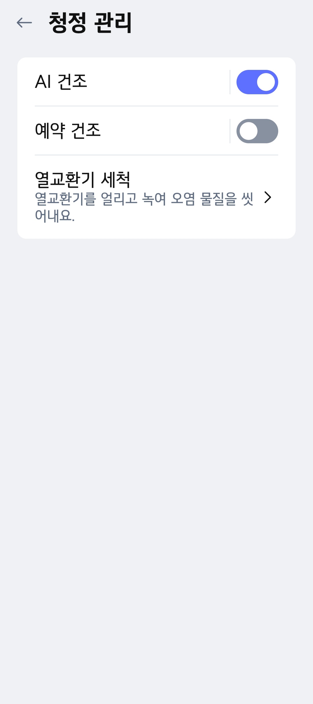 AI 건조 기능이 있어서 정말 좋은데요. 이 기능은 에어컨이 꺼질 때 바로 꺼지지 않고 15분 ~ 20분 정도 송풍이 나와서 에어컨을 건조한 다음 꺼지기 때문에 곰팡이가 피는 걸 방지해 줍니다.