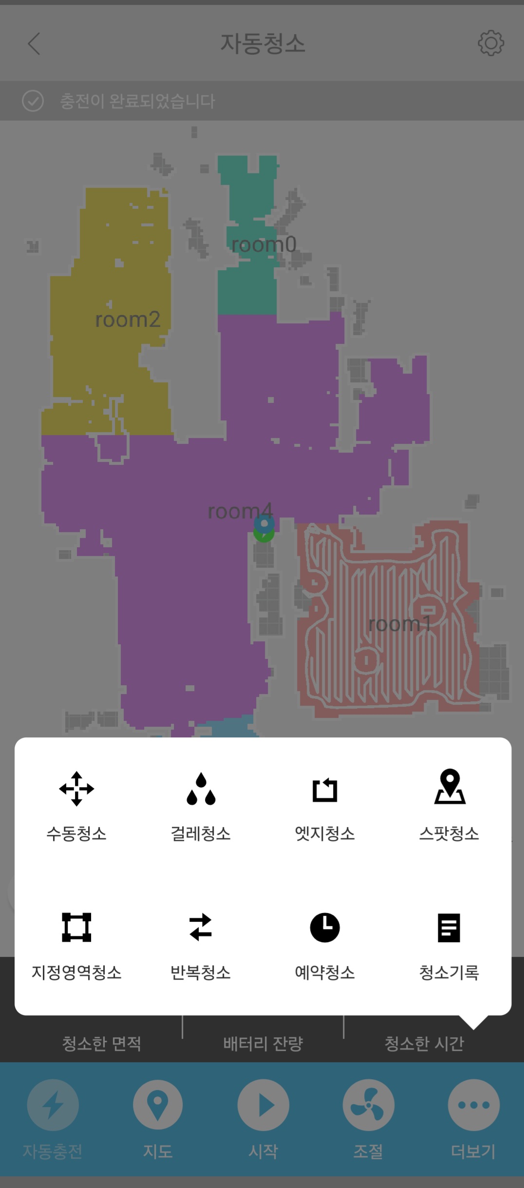 저는 주로 공간선택청소와 지정영역청소를 사용하고 있어요. 거실만 혹은 방 하나만 이렇게 청소시키고 싶을 때 아주 유용합니다.
