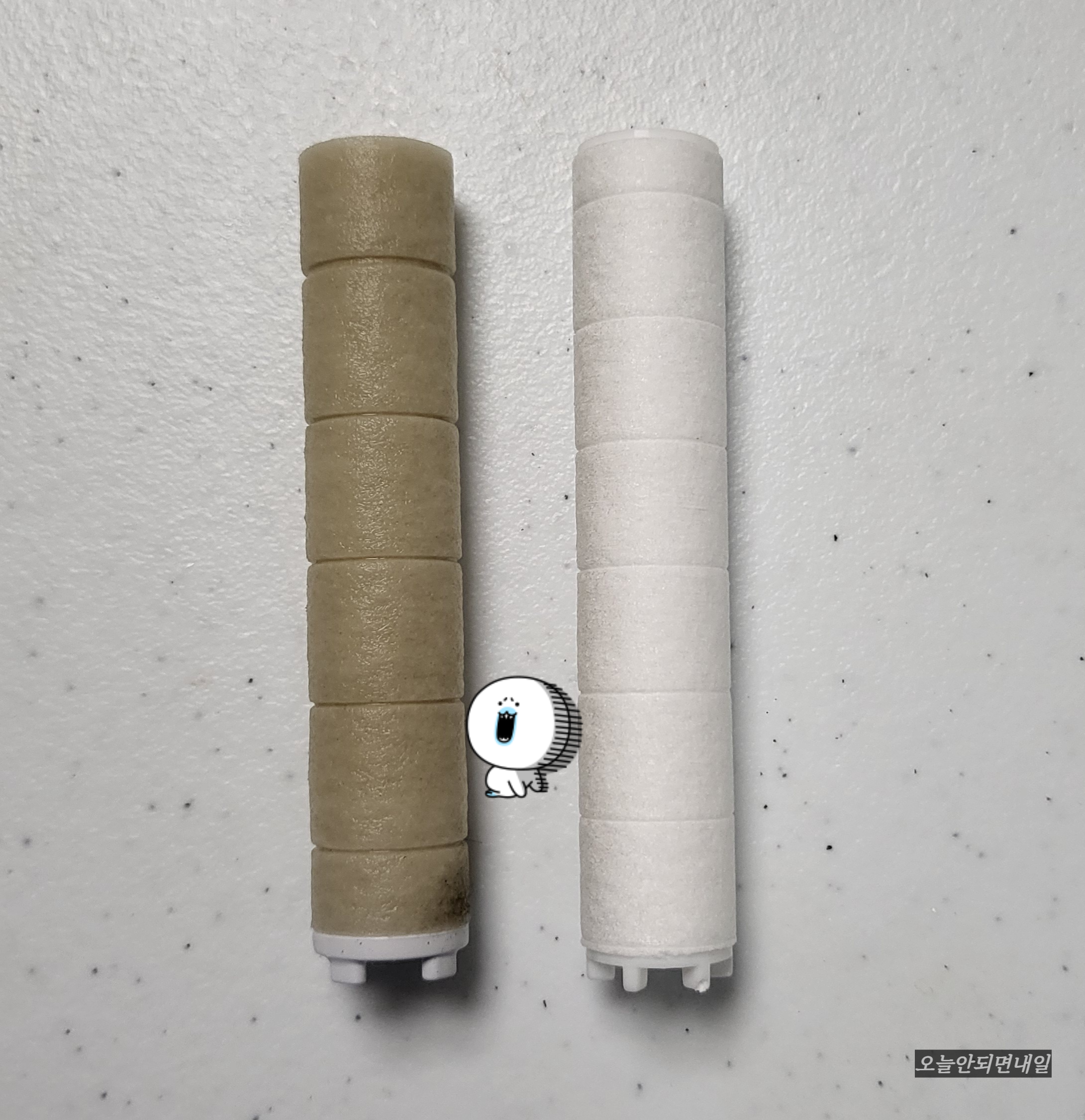 기존 필터를 빼서 새 필터와 비교해 보았어요. 많이 더러워져 있습니다. 2월에 사용 시작해서 7월에 교체했으니 6개월 정도를 사용했네요. 헉;;