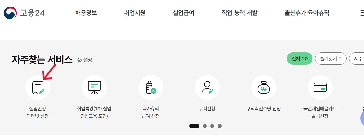 ➡️ 고용24 홈페이지 첫 화면 자주 찾는 서비스에서 실업인정 인터넷 신청 메뉴 클릭