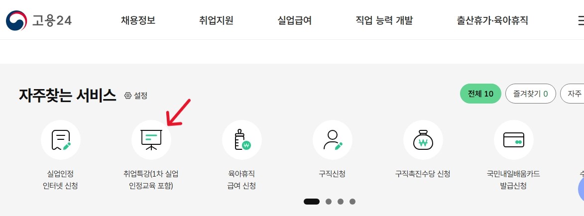 ➡️ 홈페이지 첫 화면 자주 찾는 서비스에서 취업특강(1차 실업인정 교육 포함) 메뉴 클릭