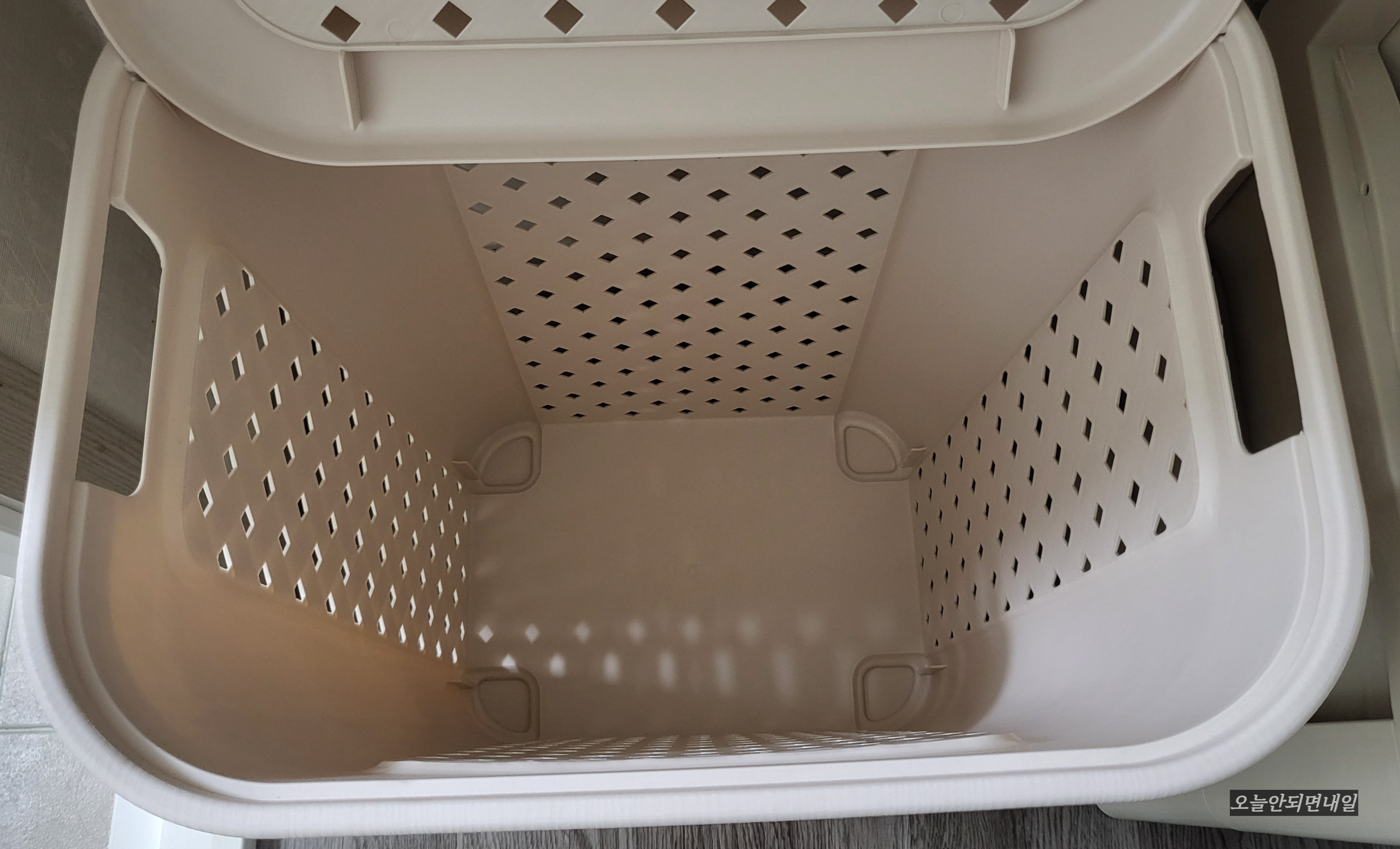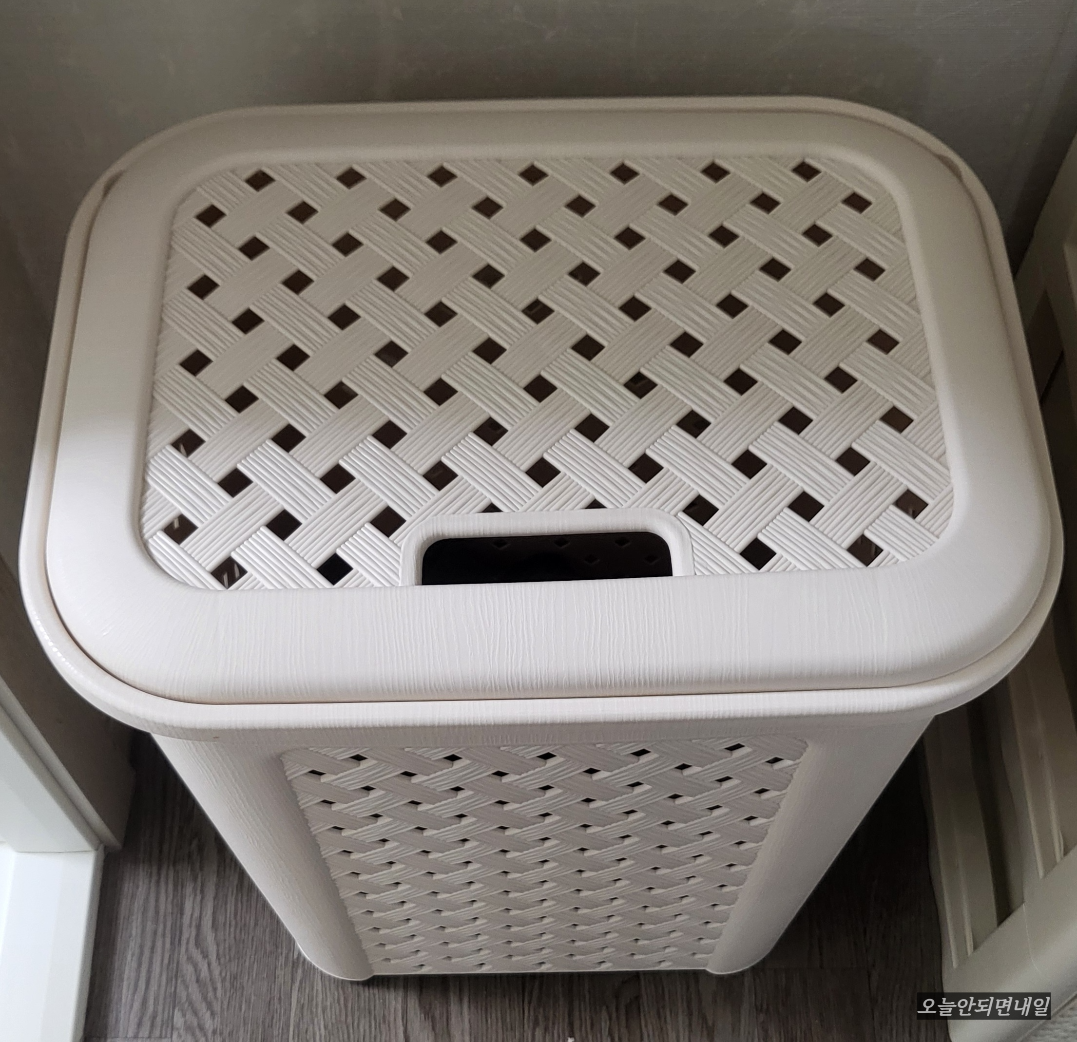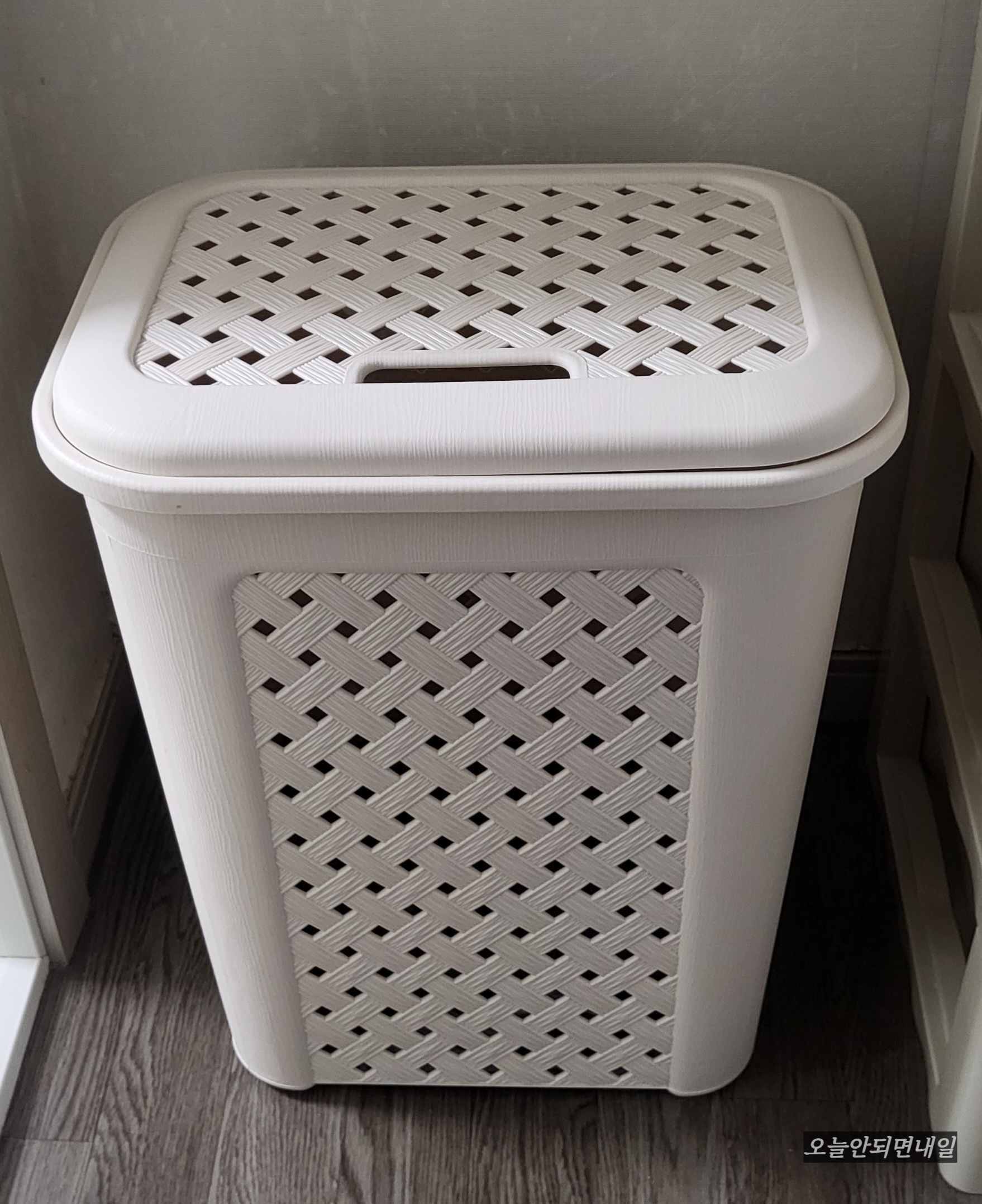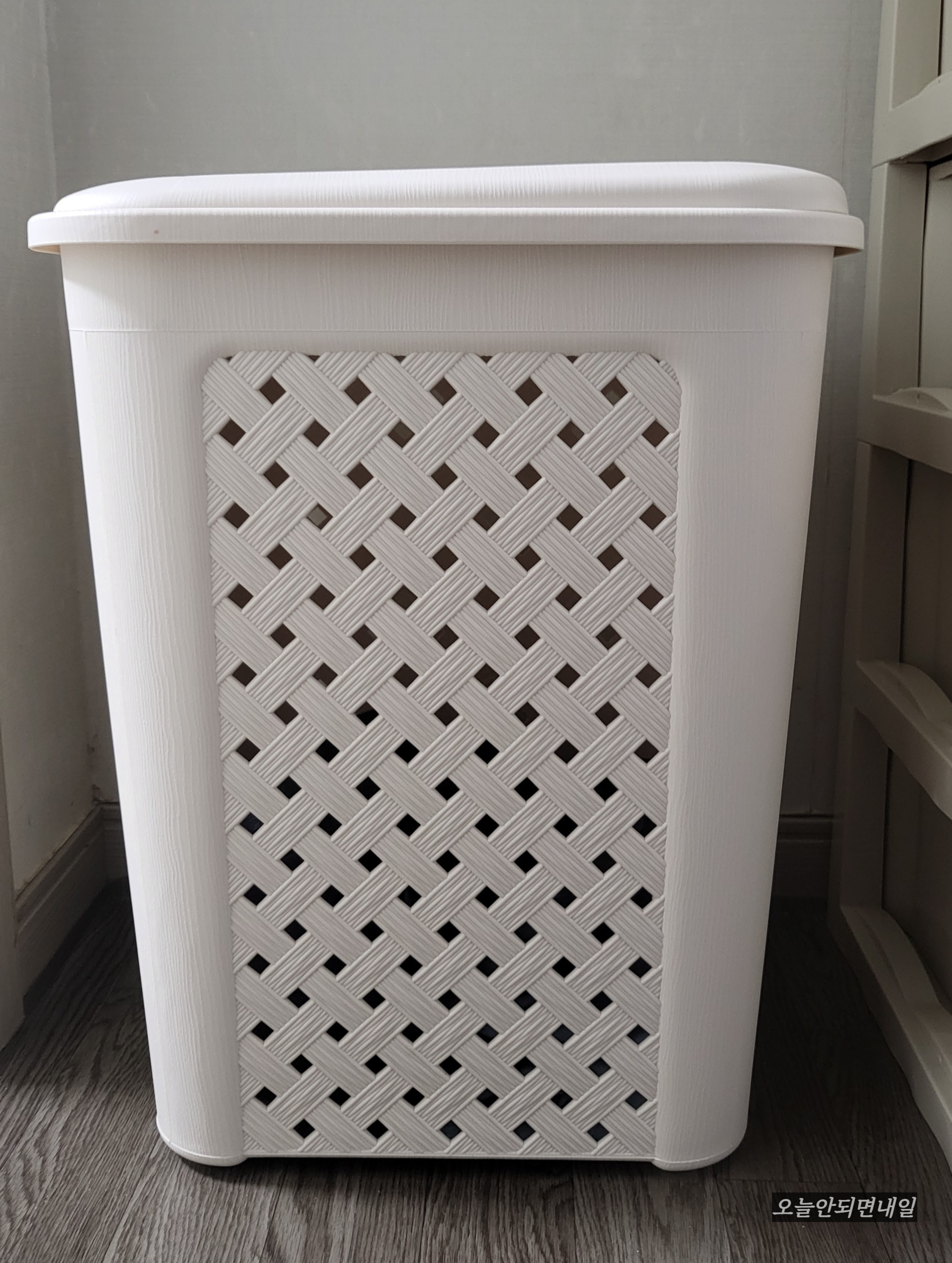 이게 별거 아닌 것 같아도 은근 스트레스받게 하는 일 중의 하나인데요. 세탁할 빨래 넣으러 세탁실까지 가는 게, 너무 번거로워서 안방 가까운 곳에 바구니를 두고 사용하니 편했어요. 그런데 바구니가 뚜껑 없이 훤히 뚫려 있으니 미관상 좋지가 않고 손님이 왔을 때 보이는 것도 싫었습니다.