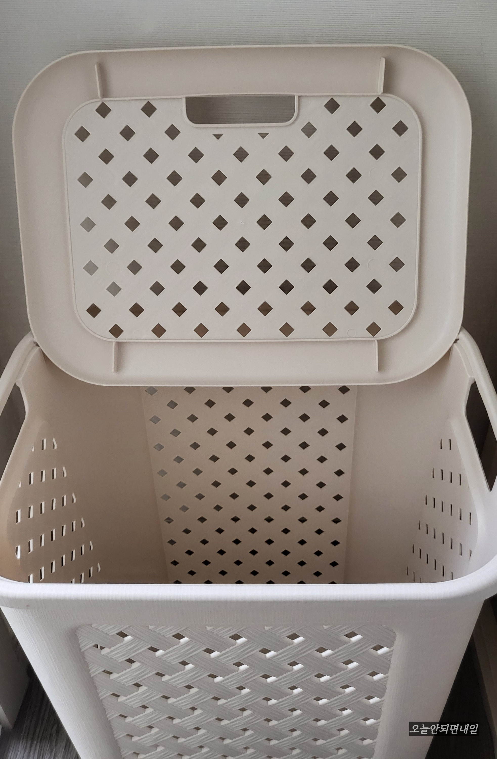 뚜껑에 고리가 달려있어서 뚜껑을 열면 고정되어 서 있습니다. 열고 닫기 편하구요. 50L라 빨래도 많이 들어가고, 3인 가족의 빨래바구니로 적당한 것 같습니다.
