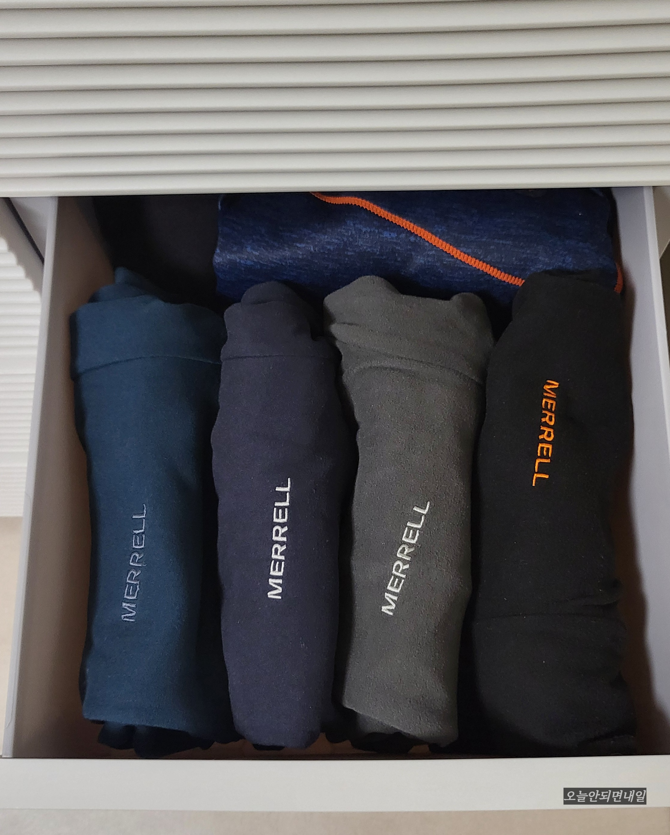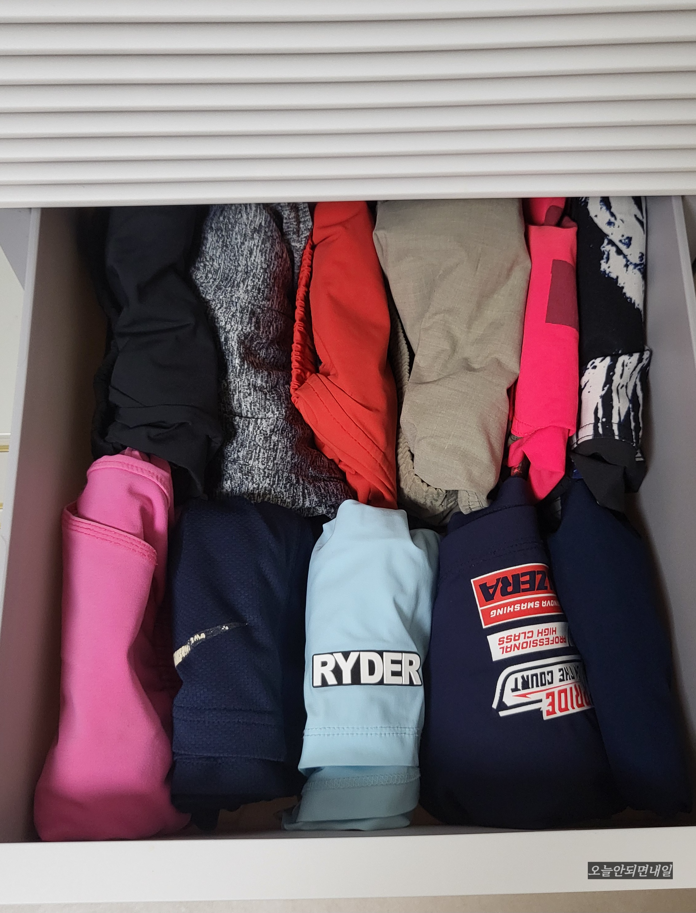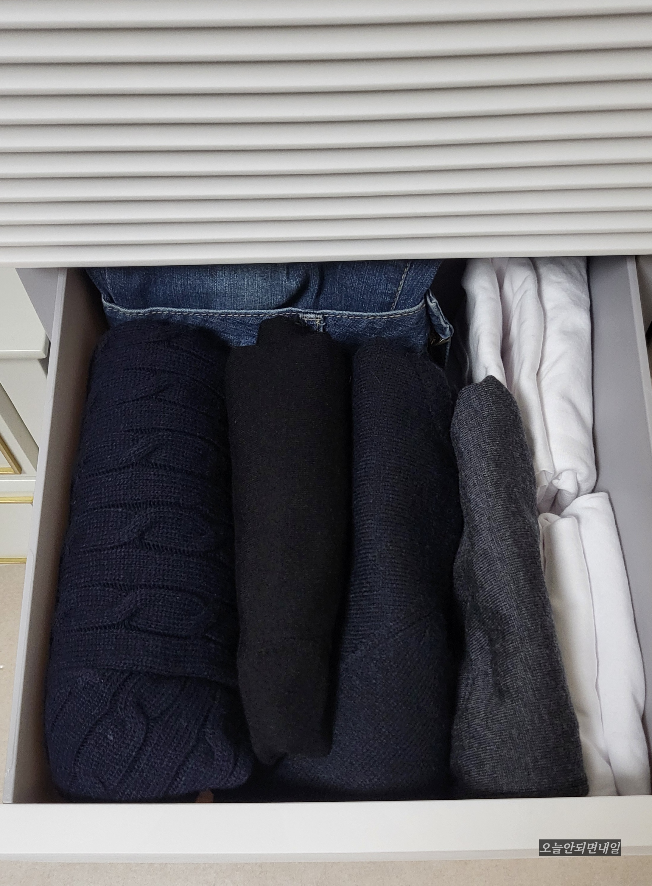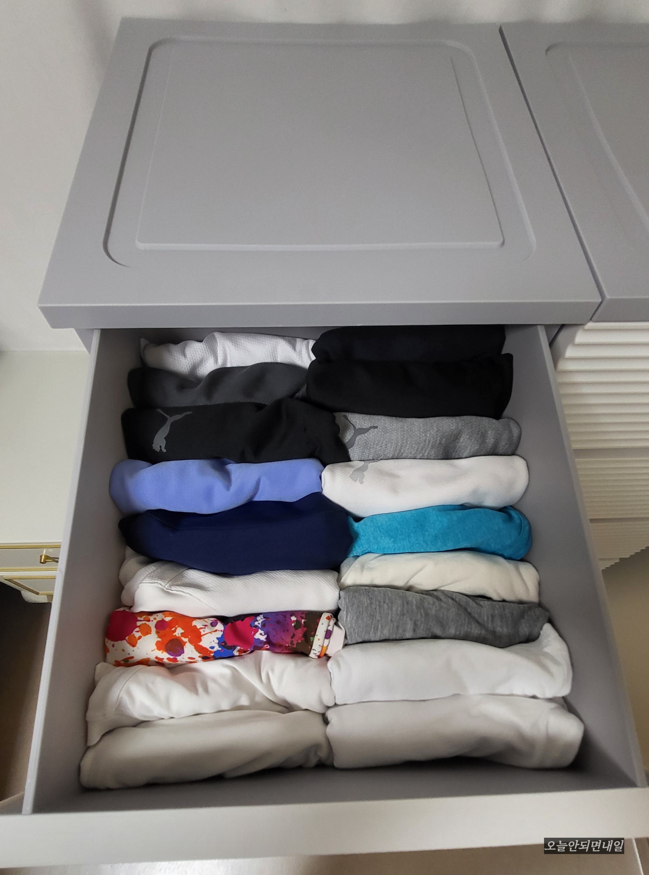 두꺼운 옷들은 옷장에 걸어두고 주로 얇은 옷 위주로 수납을 하고 있어요. 서랍 두 개를 붙여놓으니 가로길이 780 정도 되는데 거의 800 가구 서랍장 수준입니다.