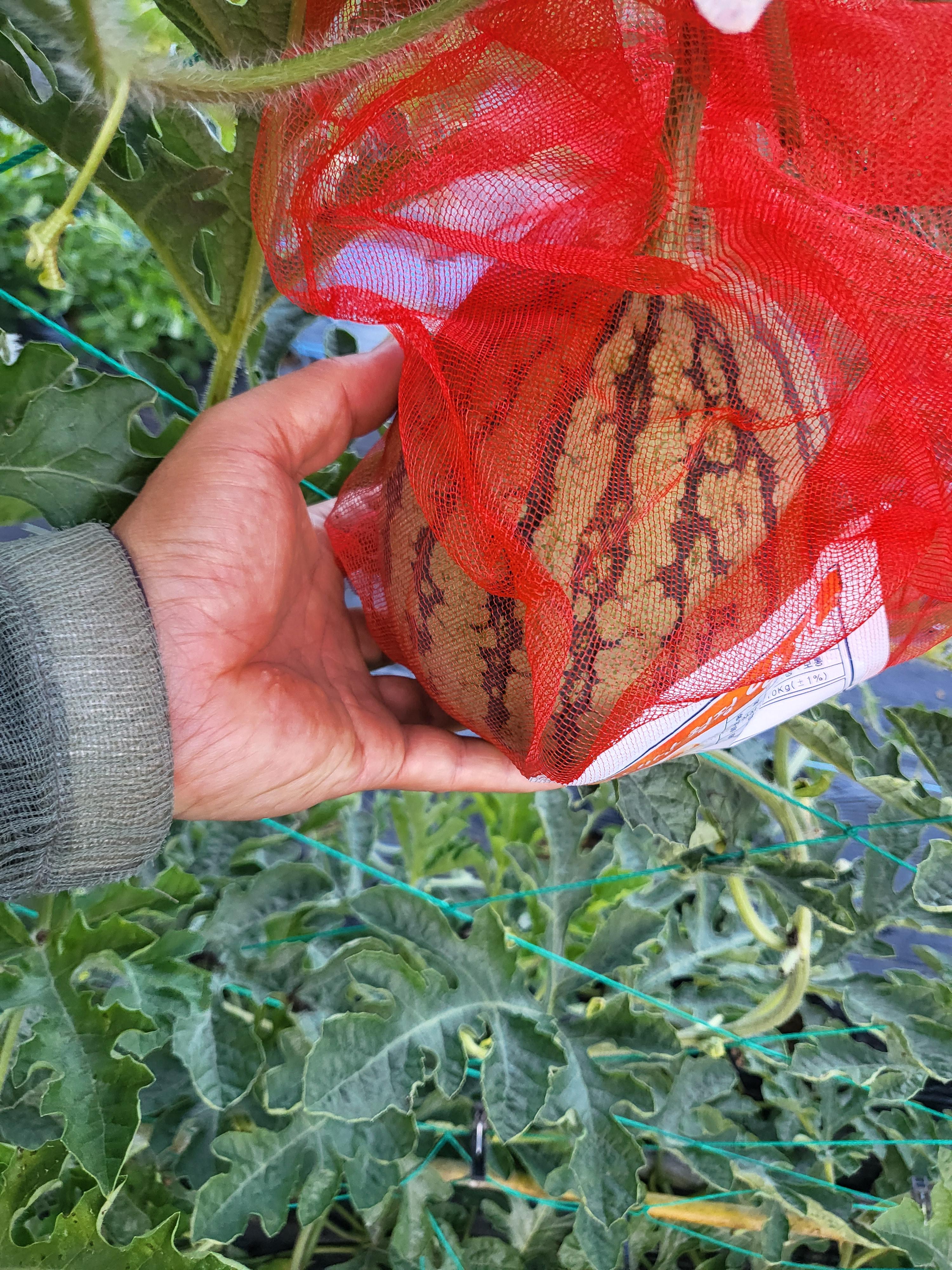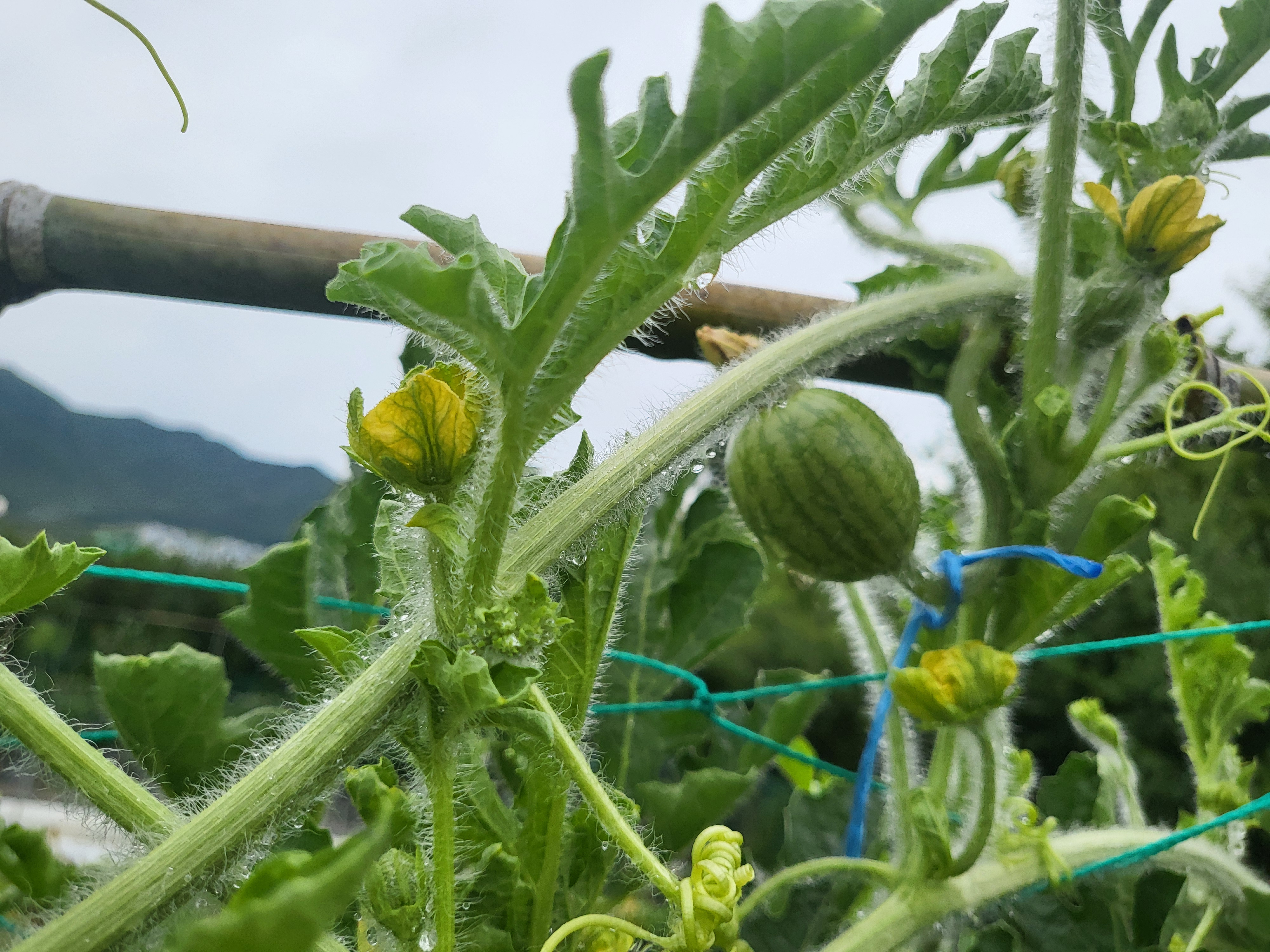 애플수박인데 저 무거운게 안 떨어지고 달려있는 게 신기해요. 노린재가 수박즙을 빨아먹고, 새들이 쪼아 먹기도 해서 수박을 보호하기 위해서 양파망을 씌웠어요.