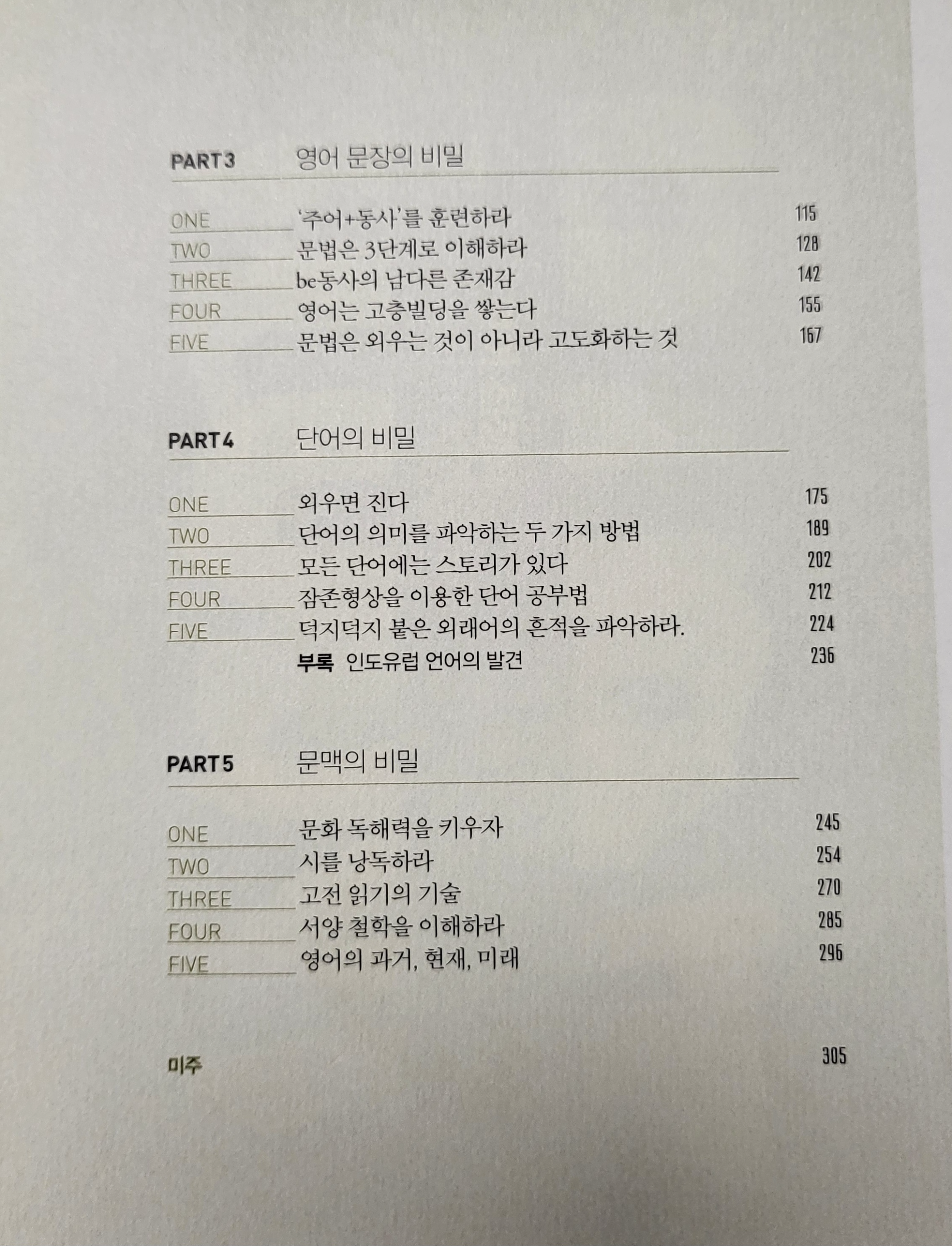 - 5부: 문맥의 비밀: 영어권의 문화를 이해하는 것이 왜 중요한지 설명하며, 시와 고전, 서양 철학을 통해 문맥을 파악하는 능력을 키울 것을 권합니다.