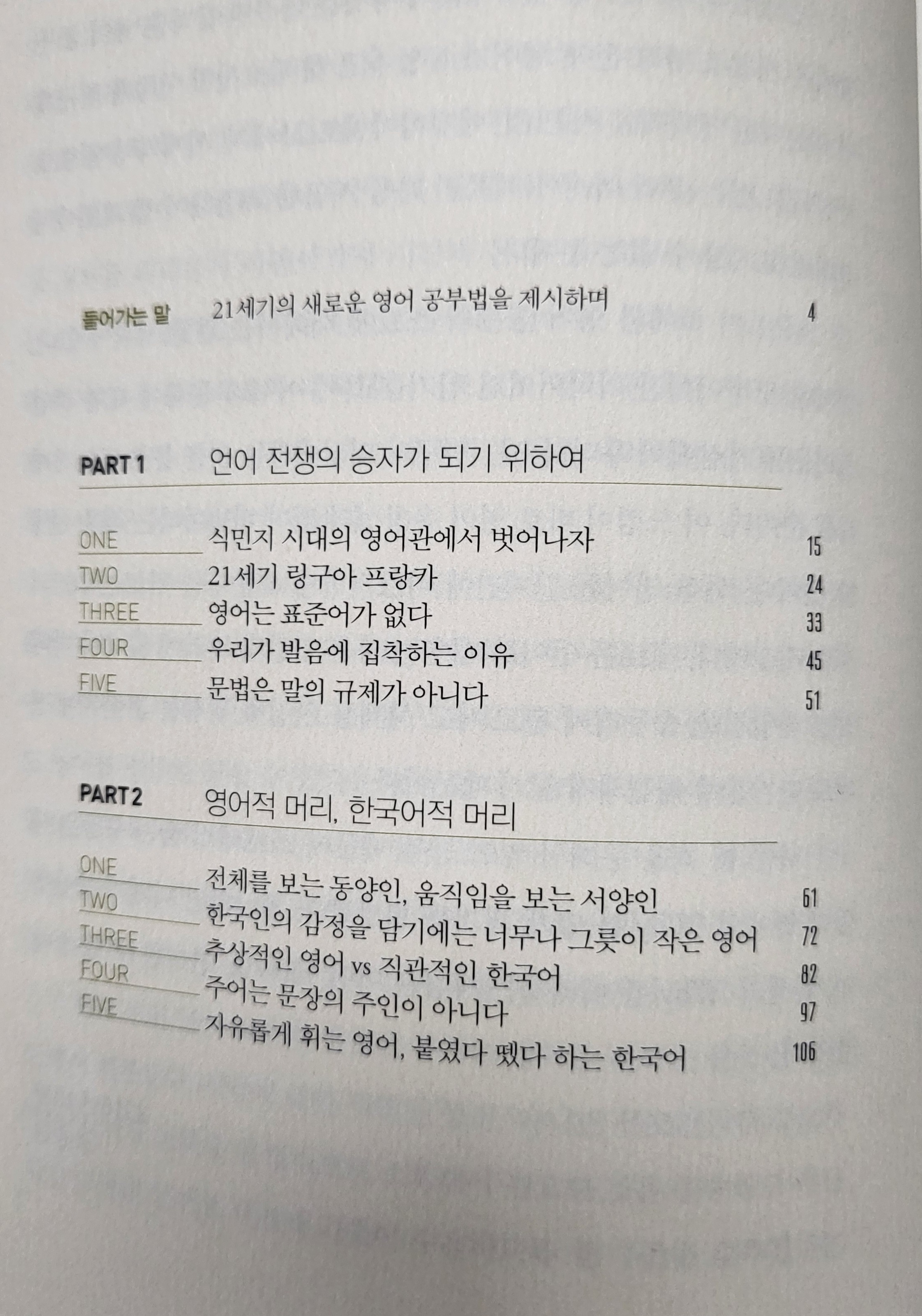 - 1부: 언어 전쟁의 승자가 되기 위하여: 영어를 대하는 우리의 잘못된 시각을 지적하고, 21세기에 영어가 어떤 의미를 가지는지 설명합니다.