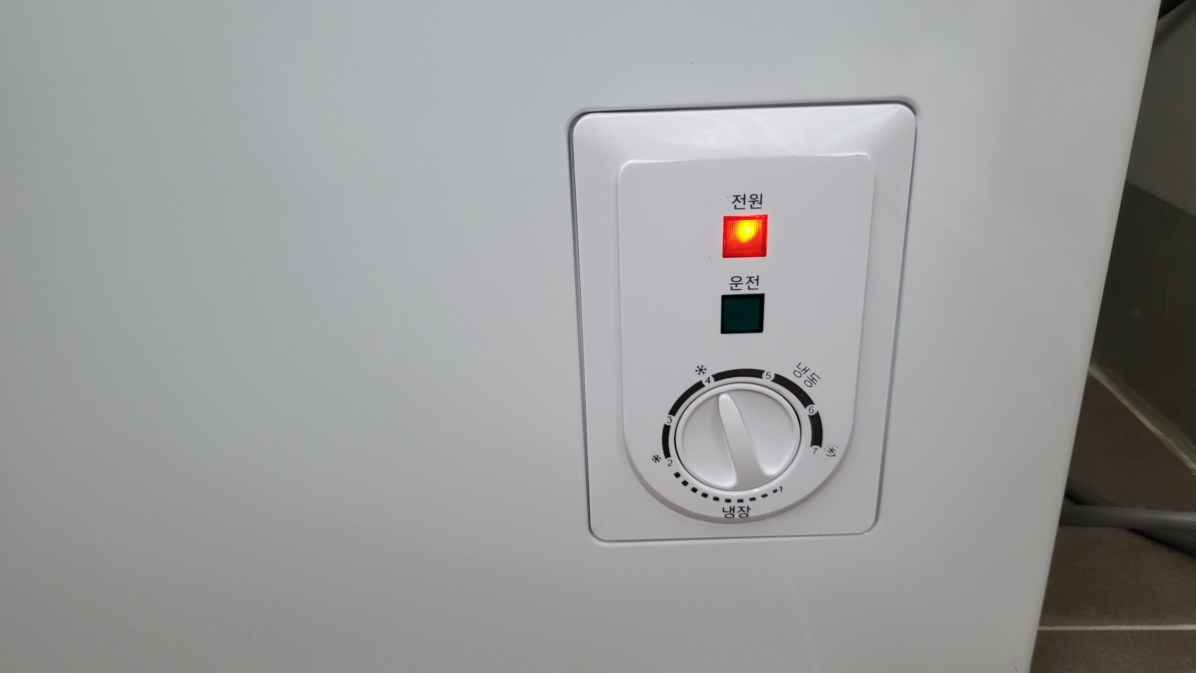 냉동고가 돌아가면 아래 운전 버튼에 초록불이 들어와요.